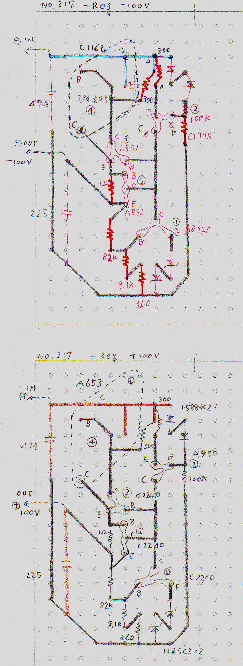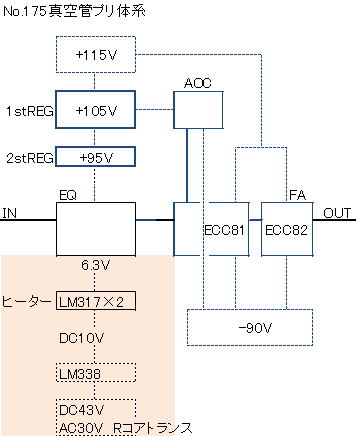寄せ集めのトランスで倍電圧式による 以下のように+のみAC10Vの別トランスで下駄を履かせる +118Vと-90Vにて動作させようとの目論見だ 理由は高圧のREGが+105Vと+100Vの2段構成のためここに手を加えたくないからだ 特に+95VREGはプリ内部に配置しているのでここは触りたくない ![]() |
