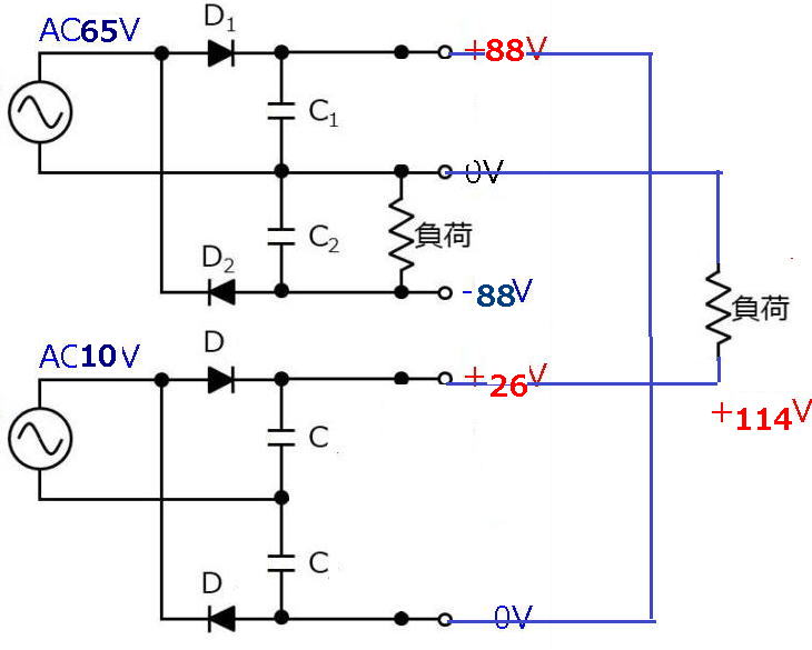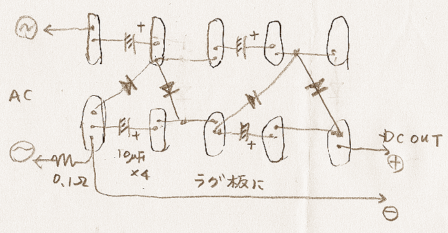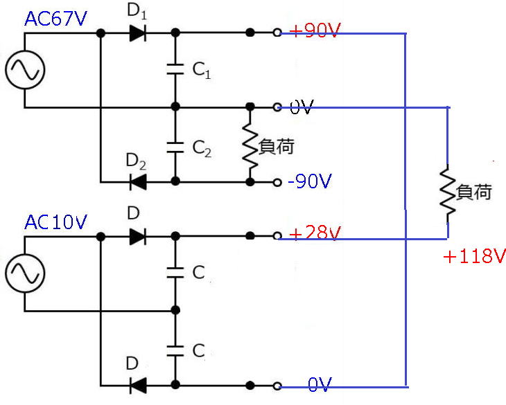 | コッククロフト・ウォルトンは未知数なので半波の倍電圧整流が良いような ただ、用意できるトランスがAC67Vが最大なので以下のように±90V程度しか出ない ![]() |