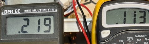 電源 トランス式だ +30Vは古いNo.128の頃のレギュレータだがトランスの関係で入力が+51Vのためレギュレータの終段が熱い 100Ωのシャント抵抗で42V入力まで落として何とか強めの温かさになる +30Vは46mA程度しか喰わないので古い100mAmaxのレギュレータで何とかなる![]() 本当は200Ω位のブリーダー抵抗なんでしょうが 手持ちなし ※計算値では100Ωで44.40Vとなっている ±15Voffにて実際の電圧も44.20V ±15Vonすると44.2→42.3Vとなる レギュレーター出力は29.5Vに設定してある 使用パーツ 可変抵抗器 2022.06.02 ゲインコントロールには10KΩ(B)VR+5.1KΩを指定しているが当機は5.1KΩを4KΩにしている 10KΩ(B)VRは手持ち無し Aタイプは有るがBカーブは無し 急遽発注する 写真の左が10KΩ(B)VR@60という代物だΦ12.7mmだから本当に小さい もう少ししっかりとしたものが来るまでこれで音楽を聴こう その時の比較が楽しみだ 金田先生は「鳴ること(動作すること)が一番」というコメントを述べたことが有る 音はその後に手当すれば良い なお右はΦ16mm2KΩ(B)で@40 安さに頭が下がる これでカートリッジ消磁器を作ろうと思う 経費 手持ちを除くと STC3060AR 4ケ 10,076 スケルトン抵抗不足分 11本 3,630 これで13,706 やはり高いのは終段だ あとのパーツは手持ちで何とか成った これで最高の音が確保できた(筈だ) ![]() ヒヤリング 2022.06.03 エージングを兼ねて少し聴いた ゲインはNo.192より少ないと感じた ゲインは相当小さい 作り方を違っただろうか? メインシステムlowCH現用のNo.159と取り替えたらチャンデバのmidとhighはゲインを絞らないとlowとのバランスが取れない midとhighにはNo.192が繋がっている しかも本機のゲインはmaxにしてもである 意外な結果となった 帰還固定抵抗4KΩ+可変抵抗10KΩ(B)を16KΩ+1KΩ(B)にしてゲイン調整を申し訳程度にする方法もあるがおそらくこれでも今までのゲインには達しないだろう 自分のシステムに合わせるなら可変抵抗は通さないですべてスケルトン抵抗を20KΩ(B)程度にするのが良いのだが何となく微調整をしたくなるのがサガ 現時点でのヒヤリング結果だが驚くべきことがある lowに他のレベルも合わせプリのゲインを上げて今までとほぼ同じバランスと音量で聴いてみた なんと低域の鳴り方が違うのである 今までよりも締まった芯のある低域が再現された 証拠に床への低域の伝わり方が大きい ズーンと響くのである 現状の位相補正CはAPSでしかも2000pFが無くて2200としている こうなるとSEコンにしたくなるが手持ちなし 買うには高いし1800と2200しか無いようだ 当面はスチコンになるか(1500+470) 過電流 2022.06.04 左のCHが熱い サーミスターの放熱対策も不十分 アラルダイトを山に盛った 放熱バーを1本追加(当初から懸念していた) それでも熱い 原因は別にあった この後両chとも右側のC960に更に放熱リングを追加 やり過ぎに越したことはない ![]() 電流計測に1Ω3Wの抵抗を使っている 左chが0.6Ωしか無い 右はきちんと1.0Ωを表示する 1%の誤差はどうしょうも無いから ひとつの目処としては抵抗を利用した電圧降下による電流測定も使える 安定したらパスすれば良いがそのままになるのが常だ 0.6以下は表示できない マルチメーターでは0.057Ω現用の電流計測1Ωの実測値 L=1.06Ω R=1.01Ω LR表示上同じに設定してもRchの方が幾分多く流れる まあ一つの目処だから そのうち同じ値のものにする ![]() ![]() ※なおこのマルチメーターの固有の抵抗値が0.07~0.1Ω近くある 1Ωに取り替えて計測 案の定 これでは熱い なおこれはSWon間もない頃だからこのままにしておくと10数分で左が290mA右が150mAになる筈だ そうとも知らずに音楽を聴いていたがノイズで気がついて見るとデバイスは触れられ無くなるほど熱い ジャンクション温度は175℃だったかな ご臨終手前までほっておき申し訳ないことをした その後は正常に動作 何とも余裕のデバイスだ ![]() 左のボリュームにつながるラインがアルミ角材の放熱バーに触れていた部分 相当熱くなったのだ 半田コテで焼いたようになっていた それでも過電流保護回路はonせず 0.1Ωを0.22Ωにして見ることもありかと たまたま保護回路が働こうとも 音楽を途中で中断されようとも アンプやスピーカーに災難が及ばなければ良いとしなければ・・・ ![]() 今回のパワーアンプに使用した主要デバイス達 2022.06.07 ![]() ※ TR8.9の単位はV 記事ではSTC3060ARのVgsは揃っているとのことだが試しに計測した 10Ω1%の抵抗で150mAを流して 5.25V 5.38 5.43(上の5.48は5.43の誤り) 5.57 となった 位相補正値の変移 ![]() ※色々な試験の末 音を第一にして落ち着いているようだ いずれにしてもどれも間違いではないから望ましい音は別として2021.11~2022.1までを試してみるのも良いと思う SEコンは高いから手持ちのものでマッチするパターンに合わせるのも一つの方法だが手持ちのSEコンにこの表の値は見当たらない 帰還素子のVR10KΩ(B)を廃止 帰還素子にスケルトン抵抗16KΩ+10KΩ(B)を使用したが ここはスケルトン抵抗のみで足りるからスケルトン直結にした これ以前は4KΩ+10KΩ(B)だったがV