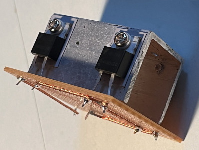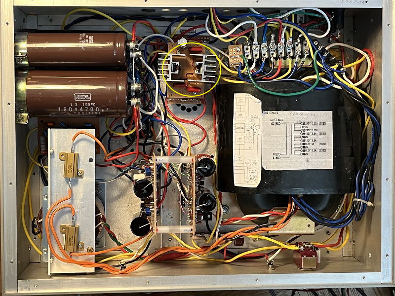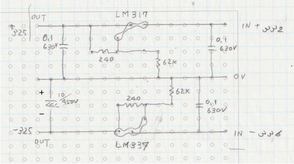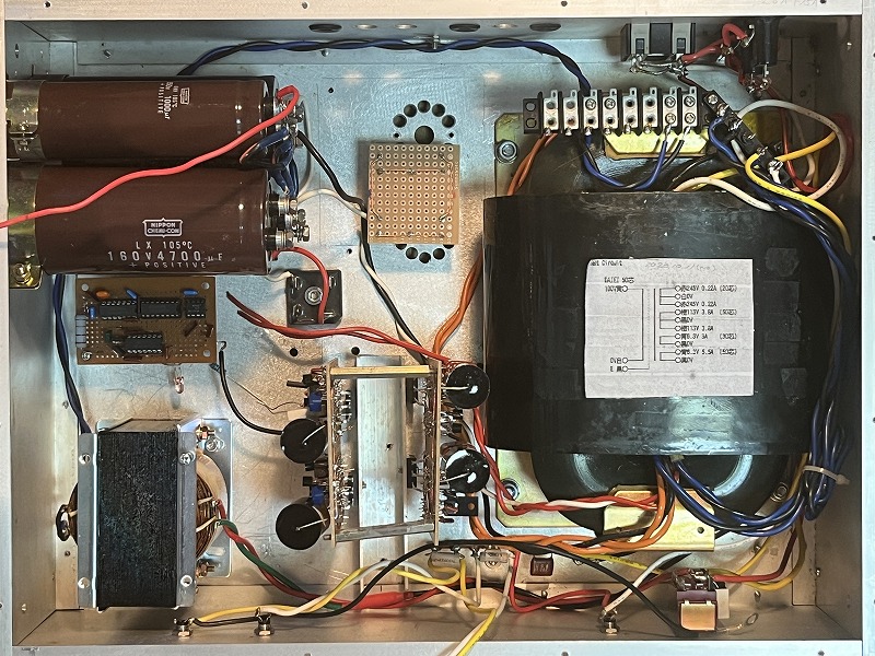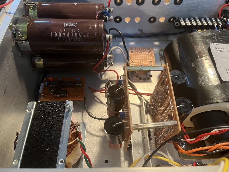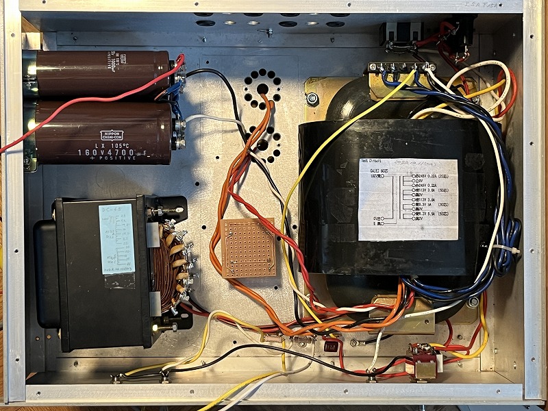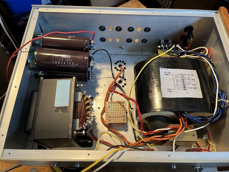 | 1号機とは違った電源になる ケース トランス ケミコン等は手持ちのものを使う 下のパーツはレギュレータのダイオードを取り付ける部材だ 底板等に取り付けるのは何かと手間がかかるからコの字型のアルミアングルにパーツを取り付けてからケース底板にネジ止めする 付いているのは オンセミ RHRP30120 ファストリカバリーダイオード 1200V30A 高圧にも終段用にも使える ![]() ![]() 在庫のトランスは電圧が問題だ 高圧は245Vが2つ 終段用は113Vが2つ ヒーターの25Vがないから別に用意する 高圧のプラス側は150~160V程レギュレータで電圧降下があるので放熱をきちんとしたい ![]() ヒータートランスはDC-65の25Vを使いたいが そのためだけには勿体ないところだ しかも大きい 在庫を探したが良いものがない 別に使用中の12V2回路5Aがあるがそれはそのままとして特注の25.2V3.5Aヒータートランスとした そんなに高くない4,950円 (税込み送料別) 使えそうな次のトランスは若松 モノタロウでも欠品 TOYOZUMI HT-305 1次:90-100-110V 2次:15-20-25-30V 電流:5A \6,803 TOYOZUMI HTR163 1次:100-110V 2次:10-12-15-16V2回路 電流:3A ¥4685 ![]() 先のダイオード基板を下のように配置した 奥に整流管の取り付けソケット用の場所を確保してあるがスペースを取るのが難点だし最近整流管は金田アンプでは使わない しかし敢えて使ってみたい 6754と6CA4の予定 これはダイオードで整流すると高圧は360V程度になるからレギュレーションの良くない整流管で電圧降下を図りたい 用意したケミコンは350V1000μFと160V4700μF ![]() ![]() |