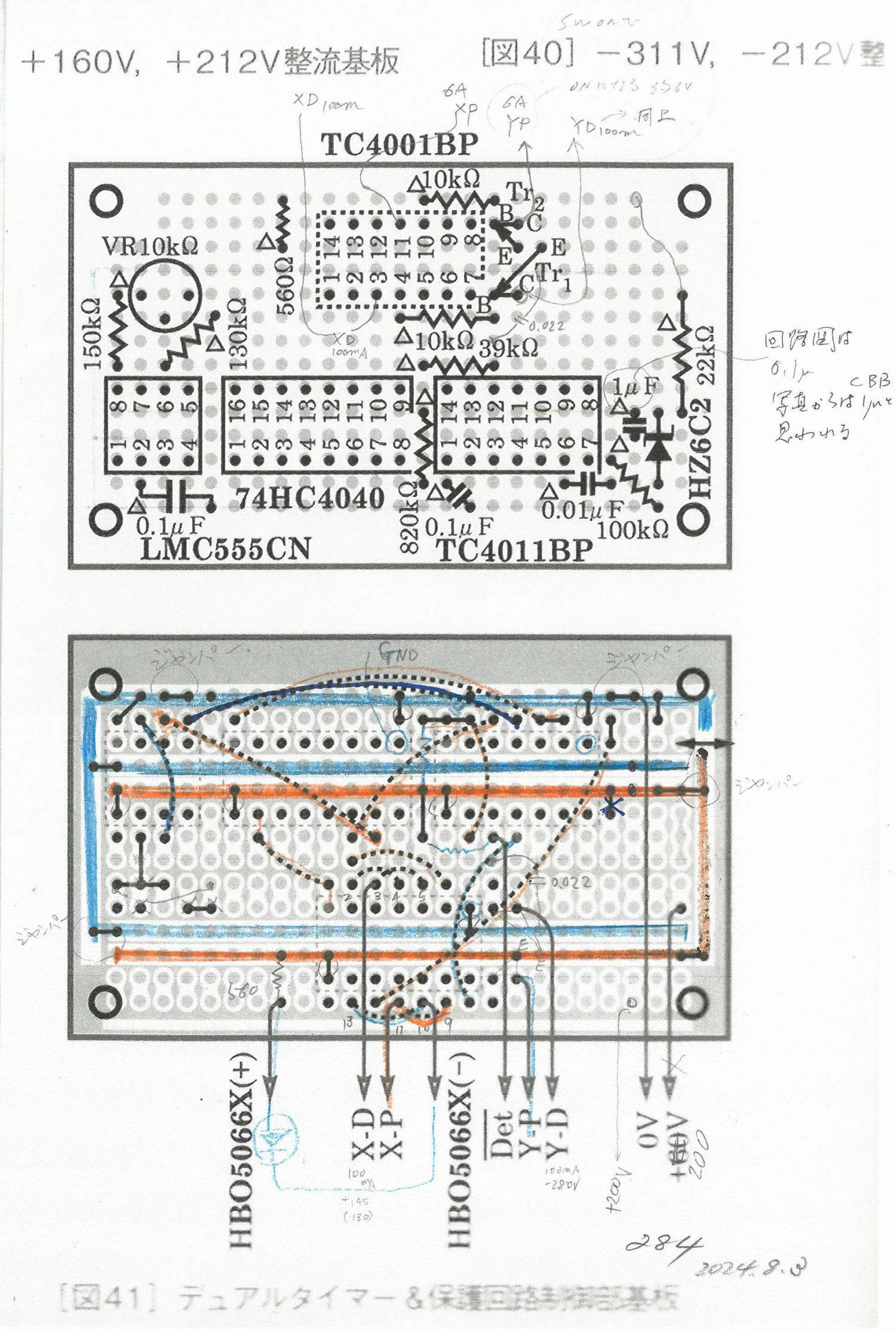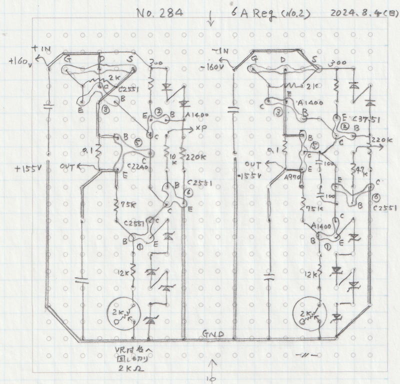ヒューズ 15A ヒータートランスは上のものでないこと あとから述べる特注品 ![]() 6A-±160V REGプリントパターン 160V程度で動作するか否かは1号機でテスト済 2号機はトランスの関係から160V以内が限界のため これでパワーアンプ1号機も2号機にもこの電源を使える 2号機の電源も含めたセットを手放したら1号機は200Vタイプに戻しても良いだろう この定数では155Vだが2KΩ半固定を左に回して電圧を160V程度に引き上げて1号機とバランスを取れば良い ![]() ディアルタイマーをまず製作 20240806 レギュレータ基板の目処はたったので配線さえ間違わなければ動作するこの基板を製作する ところが大きなミスを犯した 104のフィルムコンデンーサと104の抵抗を違えた 暑さの性でもないがチェツクは大切だ この基板に1KΩの抵抗を介して13V程度流すと6Vをツェナーする 30秒でTR1のコレクター出力がoff 60秒でTR2のコレクター出力がoffになればOKだ ところが104抵抗で電源をバイバスしていたので動作がおかしい 104のコンデンサーに替えて難なく完成となる お恥ずかしい限りだ この基板の消費電流は6.6mA シャント抵抗は記事では22KΩとなっている 27KΩ程度3Wにしたいところだ 6C2ツェナーの耐圧が調べ方が悪いのか不明なのであまり高い電圧からツェナーしたくないし抵抗にも余計な熱を喰わせたくない ![]() 以下は「ツェナーダイオード - MITACHI Web Store」から引用 ツェナーダイオードにはツェナー電圧が高くなるほどノイズが大きく、電流量が多いほど小さくなる、という傾向があります。 ノイズ対策として、ツェナー電圧の低い素子を複数直列接続する、ツェナーダイオードに流す電流を増やす等の方法があります。 電圧が2倍になると電流はどうなる? 電流(A)=電圧(V) ÷ 抵抗(Ω) →電力は2倍の2倍で、4倍になる。 ツェナーにもある程度電流を流さないとツェナー動作しないのでこの回路のみの電流は安定化電源から6Vを印加して調べる必要があるが回路としてはツェナーも含めてトータルで考えて良いだろう この基板をMJ無線と実験2022.9月78ページから引用する タイマーIC上のVR10KΩは使わない 少し時間的ズレは気にしない +200Vをツェナーするところにパスコンがあるが回路図は0.1μF 基板では1μFと齟齬がある 電源のパスコンだから大きいほうが正解か ![]() Detのラインを0.022μFでグランドへバイパスした 回路図には無いが過去にこれを付けない為に誤動作したことがあるからだ 誤動作はNo.279だった 電源REGもディアルタイマーも一応出来た 20240812 REG基板はダイオード基板と同様にコの字のアルミ部材に取り付ける 平たく配置すると場所的に底板には1枚しかつけられないから あとは横か裏のアルミとなる ![]() ![]() ![]() 電源トランスは25.2v3.5Aを特注した だいぶん小さくなりスペース的にもゆとりが出た トランスの電圧が高い 20240816 100mAも6Aもトランスの電圧が高く出る 夫々350V 160Vを少し超える やむなく夫々のACラインに100Ωと3.32Ωの抵抗で電圧降下を図るも多少の改善 ●350Vの方はswONで360V 10秒位で330Vに落ちて30秒後のREGがONして327V前後で安定する つまりswONの10秒位を耐えられれば良い ●160Vの方はswONで169V 60秒後のREGがONして160V前後で安定するが耐圧ギリギリ 心配 200V4700μFが1本あるので1本買い足して見ようと思う ![]() LM317-LM337 20240817 忘れていたがLM317-LM337を使えば良い マニュアルから フローティング方式により入 出力の電圧差に対してのみ反応するため、入出力電圧差の規定 ( 絶対最大定格 40V)さえ超えなければ、すなわち、出力を短絡 させない限り、数 100V の入力電圧にも動作が可能です。 ![]() LM317(LM317A/LM317Tなど)の入力と出力電圧の差は1.2V以上(3V以上推奨)必要 LM317はフローティング方式で動作するため入出力電圧差の規定さえ超えなければ数100Vの入力電圧にも動作する LM317は、出力電圧1.2~37V、出力電流1.5Aを供給できる正電圧可変型3端子レギュレータIC LM337は、発振しやすい 仕様書にある「solid tantalum or 10-μF aluminum electrolytic required for stability」 これは金田先生も指摘している このためLM337の出口にはマニュアル通り10μFのケミコンでバイパスしたから発振は無い 下のグラフからも0.05uF ~ 1.8uF の間が発振しやすいようだ これの実験データーがある 「LM337 発振!! のついでに定電圧レギュレータまとめ」でサーチすると出てくる ![]() 直訳すると 安定境界条件 すべてのTL431およびTL431Aデバイス SOT23-3、SC70、Q-TEMPデバイスを除く LM317-LM337 基板を高圧ユニットに二階建て配置で追加 20240818 これにてswON時から350V耐圧のケミコンには324Vが印加されることになり耐圧超えの心配はなくなる ![]() LM317-LM337プリントパターン LM317達はREG基板の電流が50mA喰うとして0.6W程度の損失だろう ![]() LM317-LM337ユニット 放熱器の温度は+が50℃ -が45℃で安心 ![]() 電源2号機にてヒヤリング中 5998AのIoはアンメータから分かる通り20mA程度とかなり少なくしている ただしswON時は60mA程度喰う ![]() デジキーでケミコン 20240819 ![]() 200V4700μF日立が1本あるので上の写真の見えないがマスナス用に配置し