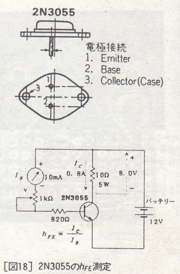 | ベースに10mAを流して10Ωの両端電圧13Vを直読する この3055はhFE=130と読めるが・・・メーカーではhFE=max70だからもっと電流を流さなければ正しい値は出ないのか? ちなみにテスターに測定機能が付いているもので測ると50~130位に分布するのだがそれをそのまま信じて良いものか? 悩ましい限り まあ傾向を見るなら良いだろうし用途によるだろう 昔のパワーアンプなら10mA程度だったと思う そして最近と言ってもNo.139辺りは70mAだからその辺りの実態に合わせて測定して選別しても良い 下図のメーカーのデータシートの例ではhFEの測定条件にIc=4.0A,Vce=4.0Vのように 結構なコレクタ電流が流れるようにしなければメーカーの言うhFE=20~70にはならないということだ ちなみに上の測定回路に見えているSTの3055もこれと同様のデーターシート記載となっている ![]() ![]() STMicroelectronics ![]() |