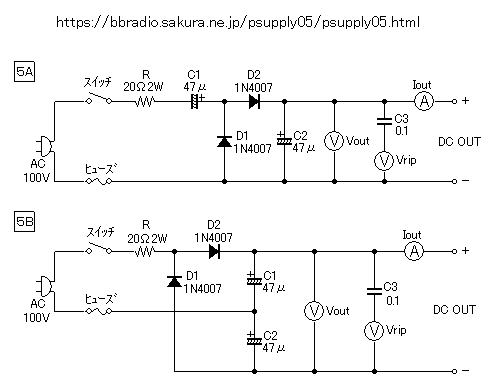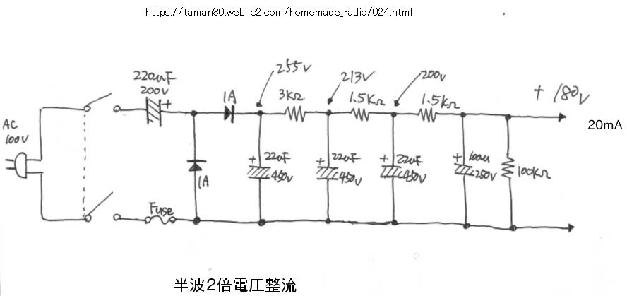 | http://www.gxk.jp/elec/musen/1ama/H17/html/H1704A17_.htmlに以下の解説有り 2つの半波整流回路が組み合わさってできています。 まず、入力交流が正に振れている半周期を考えてみましょう。すると、回路は同図左下のような状態になり、D2は導通しないので、C1に充電されます。残りの半周期では、同図右下のようになり、D1は導通しないので、C2に充電されます。 下段の2つの回路は、それぞれ半波整流回路ですから、これらが組み合わさって、入力交流の正側・負側からそれぞれ直流を作り出している、と捉えることができます。 ![]() シリーズ接続を止めた 450V47μFのシリーズ接続を止めた 2025.12.21 ![]() 右に見える治具は放電用 発光ダイオードを2ケ付けて逆接続にも対応 当初は電源SWで連動予定だったが耐圧を考慮して連動方式は止める 以下は今回使用の電源トランス 0-160V端子を使う 6.3V5~6Aもあるので勿体ないが160Voutというのはなかなか持ち合わせがない ![]() ![]() 450Vのケミコンを計測した 450V掛けて0.5~0.8mA位で手持ちのものは合格 当然ここにシリーズ接続で使っていたものも合格 倍電圧整流回路のAIによる説明では勘違いすることも 半波か全波でケミコンの耐圧が異なるが全波回路図を載せておいて半波の解説をしているものを散見 半波ではC2の耐圧がC1の倍となるのでAIを信じないこと 第5図Aは半波倍電圧整流回路、第5図Bは両波倍電圧整流回路 ![]() 半波は見慣れた以下の真空管アンプの電源からも理解できる がph7は半波は使用したことがない https://taman80.web.fc2.com/homemade_radio/024.html ![]() 巻線電流容量 https://seppotl.web.fc2.com/zht03/acdc.html に巻線電流容量のどれくらいが夫々の回路の直流出力電流になるかが載っていた ①半波整流 巻線電流容量の 約45% が直流出力電流となる ②両波整流 〃 約90% ③ブリッジ整流 〃 約63.7% ④両波倍電圧整流 〃 約31.8% ⑤半波倍電圧整流 〃 両波倍電圧整流とほぼ同じ ブリッジ整流の場合は約6割と承知していたが 今回のトランスは35mAだから④から見て11mA程度しか取れないことになる 倍電圧にすると半分になることも聞いていたが63.7→31.8%だからやはりそのようである 放電 450v 47μf放電電流50KΩ の設問でAIに聞いた 450Vの被測定ケミコンを50KΩ抵抗で放電すると9mA 4.05W 時定数は37%容量下げるのに50KΩ×47μFで2.35sec これの5倍で完全放電とAIが答えている さて正しいか? ※時定数は、電圧(または電流)が初期値の約37%(\(1/e\))まで低下するのにかかる時間を示すらしい |
