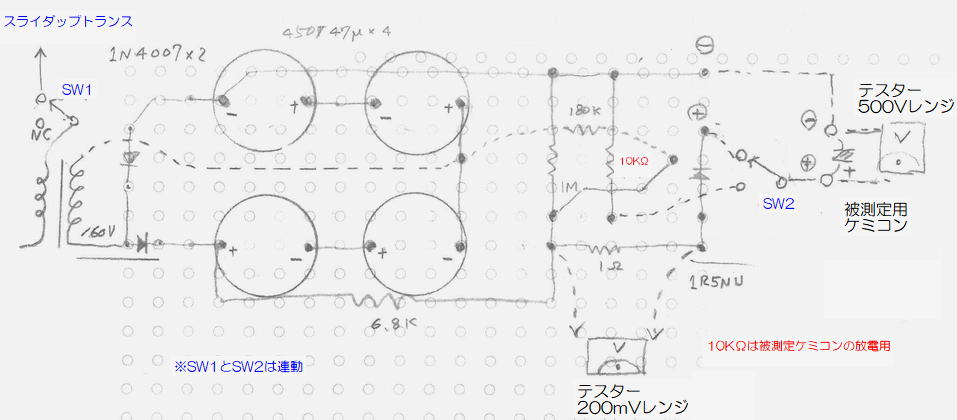| ジャンクパーツにてケミコンテスターを製作した 今回はNo.2となる 電源トランスに160V.180V.200V端子があったので160Vを用い電圧可変はスライダップトランスとした (使用例:スライダップトランスで47V前後で電源トランスは75V出力 被測定物には200V印加) 350V.450V耐圧のケミコンを測定したい 上の回路では450Vのケミコンをシリーズにして耐圧を稼いでいるが大袈裟かな |