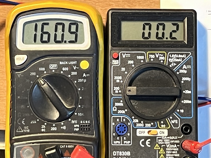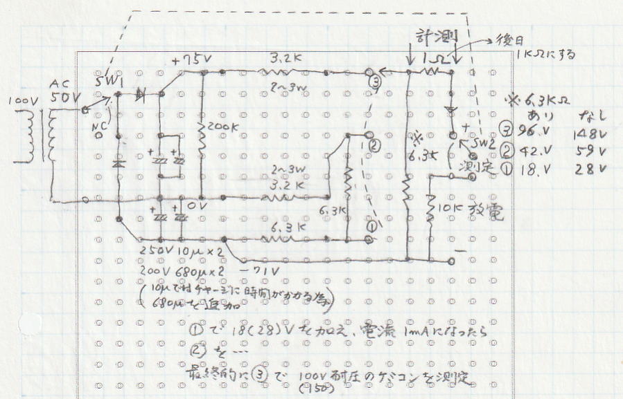 ![]() 計測点にはメーターを付けるとよいのだがフルスケール1mAと30mA位にするための調整抵抗チョイスが面倒 結局1Ω抵抗の両端をテスターではかることにした 適当なラジケーターもないためメーター式はそのうちだ @28Vレンジで1mA以下(画像省略)になったところで Aへ進む A59Vレンジでも下の写真のように1mA以下でクリヤー ![]() B最後96Vレンジで漏洩電流は1mA以下ということで合格 ![]() |