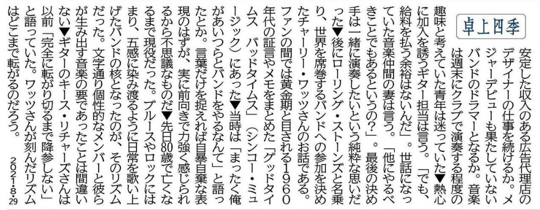 英ロックバンド、ザ・ローリング・ストーンズ(The Rolling Stones)のドラマー チャーリー・ワッツ(Charlie Watts)さんが24日死去