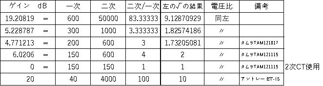 | トランスを通して聴くDENON DL-102が提供するモノラルLPの音楽世界は DL-102本来の性能が得られる訳ではない 無理してトランスってどうかな タムラ、タンゴのライントランス流用を ファインメットコア等の最新技術トランスは帯域が広いようだか、旧来の電磁鉄製品の方が中低域の個性があるようだ 入出力のゲインをdBで示すとき、 電力は 10log(Po/Pi) 電圧は 20log(Vo/Vi) 以下は 600Ω:50KΩのトランス |