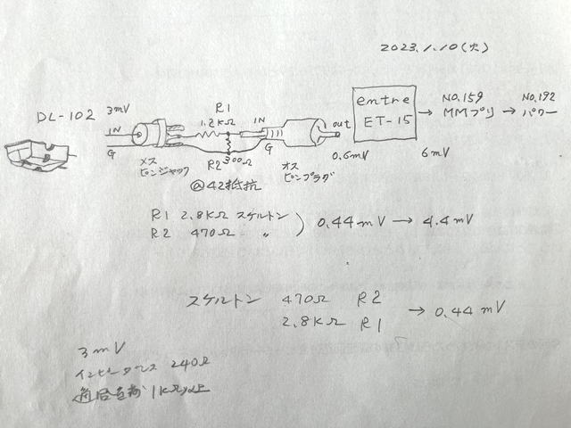 手持ちのMCトランスの前置型の抵抗アッテネータを作り実験した 下図はR1 2.7KΩ R2 470Ωの分圧器 これで3mVのDL-102の出力が0.44mVとなりトランスを通り4.4mVと適正な値になる筈 カートリッジの出力を落とすのは些か不本意 しかしトランスに予期せぬパワーを入れるのも気が退ける 実験の結果良好だと思う ![]() |