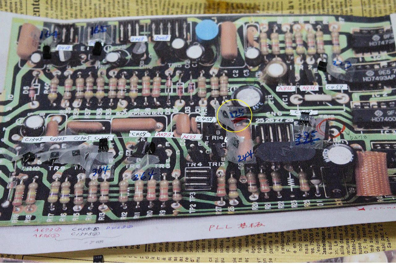 | DPシリーズ特有のトラブル 2SC458が元凶だ 手持ちのDP-6000もサーボーが乱れる コピーした基板図に取り替えたデバイスを貼り付けておく どこの部位の458がどうしたのか後から調べる ちょうど真ん中の125というものは 458のhFEだからだいぶん劣化 458は全部取り替えた それにて正常化した |