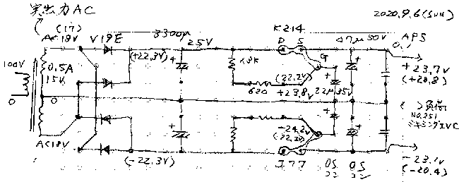 ゲートからアースしているOSコンをチェックすると47μF16vだった この基板はツェナーダイオードを1.3KΩからアースして+7.2v-4.8vに使っていたのでその時は良かった それでも知らずに暫くエージングしていたが壊れていない 案外強い? 当然22μF35VOSコンに換えた そんなこんなで出力をチェックすると+側が出力しない? 早まってk214を替えるもNG 結局22μF35VOSコンがショートしていた 何かの実験に使ったのでそのとき1つが壊れたのだろう OSコンは頃れるときショートするから出力への影響はなくて助かる時がある ヒーター6.3vに+100v位を誤って繋いだときもOSコンがショートして助かったことがある そうでなければ繋がっていた球はすべて昇天の運命だった