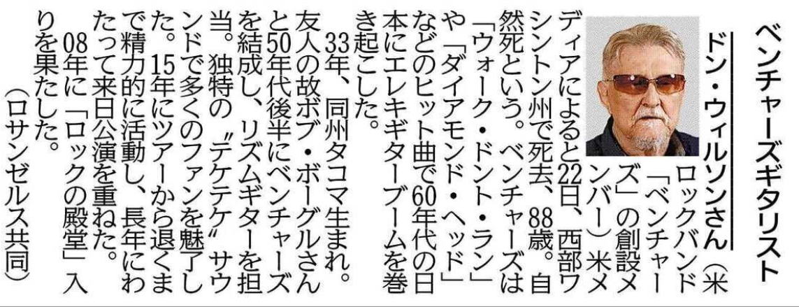 北海道新聞から 2022.01.25 Donald Lee "Don" Wilson, 想い出深いバンド 追悼に一曲聴きたい キャラバン 2018.3.13 (元)ザ・ベンチャーズのノーキー・エドワーズも、82歳で死去している https://www.barks.jp › news 好きな奏者だった パイプラインも聴きたい