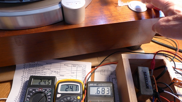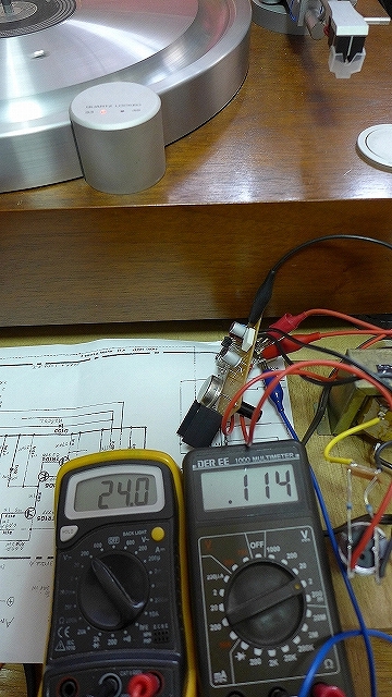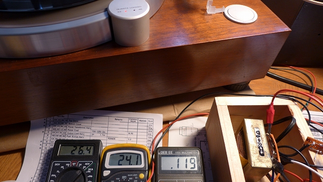 裏のパネルを外して基板を確認 ダイオードD104には外部電源の+24Vが繋がる その下の27KΩR105には外部電源からのFBが繋がる ![]() ![]() ![]() 電源トランスは 27V1A位ではないかと思う ![]() 1000μFのケミコンだ 何と貧弱な・・・ これで外部電源(4700μF50V)が持て囃される理由が判った ![]() 背面の24V入力端子のFBからは商用電源103.4V時に+23.2Vが出ていた ![]() ![]() 24V入力用のコネクターが黒く汚れていたので紙やすり等で清掃の要あり ①MJ2955を使ったレギュレーターで試す 24Vレギュレーターのテスト レギュレーターの終段はTR(MJ2955)に小さなヒートシンクを付けた 回転時 114mA喰う ![]() START/STOPのSWon・off 時は24Vが少しダウンする(23.4Vにドロップ) 電流は一時的に726mA喰う これは回転数セレクト時も同様となる 700mA程度喰っても24Vをきちんと維持するレギュレーターの見直しも必要か? しかし切替時は音楽を聴くわけではないからこんなものかと割り切ることも大切(内蔵電源はどのようなことになるのか つまりSTART/STOPのSWon・off 時や回転切替時にはドロップするのか・・・) ![]() 本体内蔵電源からこのレギュレーターに変えるとSTOP時のターンテーブル停止は2秒強で済む(1回転と20度→380度) あとは音がどのように変わるのかだ 少し聴いただけだがスッキリとし見通しが良くなった 音の粒立ちが良くなった S/Nの向上から派生する現象なのかも ②2SK3163を使ったレギュレーターで試す 2020.04.05 アイドリング START/STOPのSWoff 時わずか76mA(①③も同様) この待機時には33/45回転のインジケーターが点滅している なお内蔵電源時は点滅しないがこの区分けは何なのか? ![]() 回転時 120mA前後 きちんと24Vをキープしているから( ①も同様だ) ![]() STOP/STARTのSWon/off時 僅かドロップする 原因は電源トランスだった 24V1Aの電源トランスをだましだまし使っていたが・・・ ![]() 電源トランスを替えた 入力AC110V端子を使い 2次側AC30Vを使ったら 下図のようにドロップしない ![]() |