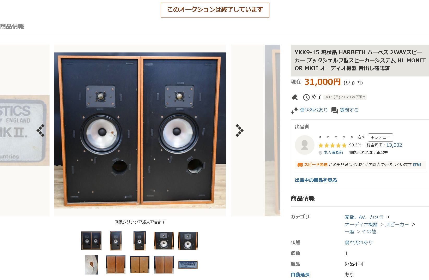 2WAY2スピーカー バスレフ型 8Ω 87dB W325×H640×D300mm 13.5kg 使用ユニット 低域用 :20cmコーン型 高域用 :2.5cmドーム型 再生周波数帯域 :50Hz~20,000Hz ポリプロピレン・コーン Ser.no1325AとB HL MONITORらしい響きの豊かさが魅力のハーベスのスピーカー。英国製ならではの中域の密度感に加えてゆったりとした響きが特徴 □1978年、「Monitor HL」を日本国内で発売。 □1979~1985年の間に「MonitorHL-MkⅡ」「MonitorHL-MkⅢ」¥298,000pairへと改良を加える。 幅325x高さ640x奥行300mm 別売:スピーカースタンド(1台、¥14,000) 外形寸法 幅325x高さ250x奥行300mm オクで片方のコーン破損のものを入手 その方が色々と解体など出来て楽しい |