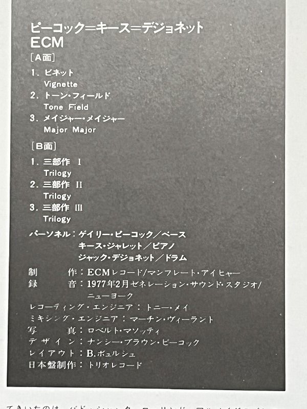 | ピーコック=キース=デジョネット / ECM Keith Jarrett このレコードB面2曲目終わりの方 ピアノの何ときらびやかなこと MarantzEQでもきらびやか それではとメインシステムで聴く 素晴らしい ジャケットの色の濃いものと2枚あるが音は変わらないような? 濃いほうがW-Germany製 薄いほうはTRIOレコード 音に変わりはあるだろう ![]() ![]() 以下に解説がある https://note.com/tatsuyasato/n/nded6b365604d 曲の解説があるのは嬉しい このレコードはライナーノーツに解説がないから このレコードのタイトルはこのサイトによると「テイルズ・オブ・アナザー」とのこと ジャケット上部をよく見ると書いてある 人の名と同列に並んでいるから見過ごした |