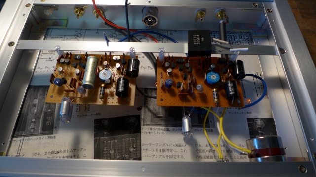 | フラットアンプ 記事のとおりだが初段2N3954にEQ素子が繋がるゲート抵抗はMMの場合2KΩが指定値だが今の処は1KΩとしているが特に支障はない 今後この抵抗に1KΩの半固定をアース側に追加して適当なポジションに合わせることも良いかと思う 昔の3chパワーアンプで同様の処理がなされているがゲインの可変範囲は限られていた 配線 隣り合わせのランドでも7本より線は使わず部品のリード線を折り曲げて使用することはNG 金田先生は「MJ無線と実験」2009年3月号に「たとえ隣どうしでも、リード線を配線代わりに使わない。」とある。 またパーツの足を折り曲げてハンダ付けすることについて 基板の作り出しはパーツの取り替えが必要なことが多いから曲げないでストレートにしている ハンダは丸く盛り上がらない 富士山のようになる 足も少し長めにしている これの音への影響は比較していない あとからコテで曲げようと思っているが大半はそのままとなっている |