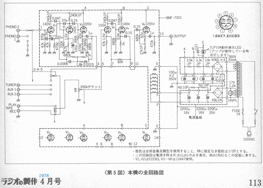 | ラジオの製作 1978年(昭和53年)4月号 「名機マランツ♯7を現代化したプリアンプの製作」の記事がある 以下の第5図参照 この古い雑誌は手持ちの在庫から見つけた 半世紀ほど前の雑誌、当時600円だから安くは無かったと思う その頃時はオーディオよりも無線に興味があった時期でアンテナ製作の参考に購入したものと思う この記事でイコライザー回路が紹介されているがイコライザー素子のC015の値は5600pFではなく後期型7Cの6800pFとなっている V1-2段目ののカソード抵抗R068(オリジナル回路番号)は7kキットでは6.2KΩだがここでは4.7KΩだ |