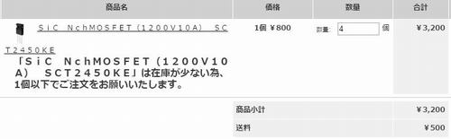 | 送料のネック 地方の僻み | デジキーにて買っておこうと思って他も含めそれぞれを覗いたら・・・ 細かい話になるが、以下の通りである。(2015.7.22調べ) SCT2450KE デジキー 673円×10=6730+送料2000=8730円 秋月電子 800円×10=8000+送料 500=8500円 とても、2000円の送料を払う気にはならない。色々な障壁があるものと思うが、Amazon等で送料無料に慣れているからどうしても拒絶反応が出てしまう。このことが良いのか悪いのか? SCS120AG デジキー 2630円 秋月電子 1200円 SCS106AG デジキー 673円 秋月電子 300円 これらをまとめて下図のように秋月から買うのが安いことになる。デジキーがすべて安い訳ではない。ただ、秋月ではSCT2450KEは9個が限度らしい。 まてよ 2SJ217(60V/45A/150W/オン抵抗0.033Ωtyp)は手持ちがない。2SJ77(160V/0.5A/30W)は沢山あるのに・・・。 これは、6C33C-Bのパワーに使われていたが、そのアンプは製作していないから、実物は知らない。 若松通商で2SJ217は787円。秋月には無いから、SCT2450KEを880円で若松通商から買っても、あちらこちからバラバラに買うよりも効率が良いかも(スケルトンも若松通商しか無いか)?等とオーディオは悩ましいのではなく、本当に悩むから。 |