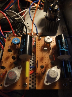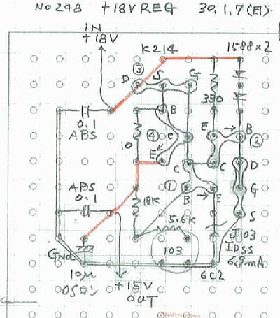 | これらのことからこのシリーズを製作されてカレントラインアンプにおいて何らかの不都合が発生した方はヒーターバイアスをもう少し引き上げても良いと思う No.154のRD36F×2(シリーズ)の例のように あるいは私のように高圧を±100V程度にするか 起こりうる事象はカソードのショートにより ヒータ+6.3VReg Rk470Ω +18V に相応の支障が出るだろう |