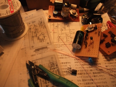 | 717A基板 | 2017.12.22![]() 左上の斜めに配した12KΩを乗せるのを失念 少し時間ロスをしたが うまく動かないほどにやる気が出る 楽しみが増えるオマケだ ![]() 25回転BOURNS社高精度多回転ボリューム ![]() EQ同様に7本撚り線を足にハンダ付けした 袴?を取り去ることも試した金田先生の真似はしない ここの部分で結構な放熱効果が期待できる 熱恐怖症の私には貴重な袴だから ![]() ( )は5847のデータ ![]() 各回路図はMJ '16.08月No.248から引用 ![]() 手前の大きな放熱器は6.3V用 それでも717Aにしてから少し容量が減ったので助かる ![]() 717Aマッシュルームは何とも愛らしい ![]() この小さなケースに押し込めて申し訳ない モノーラルだから成せる |