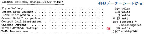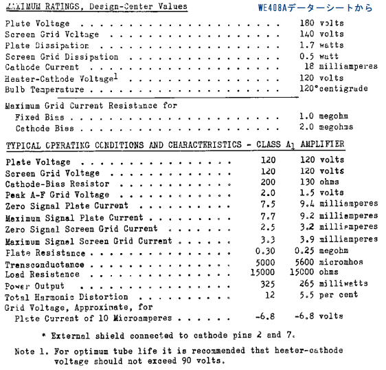 | 上のWEのデーターシート疑問解決 WE408Aのデーターシート抜粋 下の Note 1.に最大定格120Vを90Vで使用されるとロングライフ・・・の趣旨の記述がある 率で言うと75%となるがこれはたまたま私の好きな数字だ 4分の3でもある ![]() for optimum tube life if is recommended that heater-cathode voltage should not exceed 90 volts. ヒーター - カソード電圧が90ボルトを超えないようにすることが推奨される場合には、最適なチューブ寿命が得られるようにする。 直訳では良くわからない |