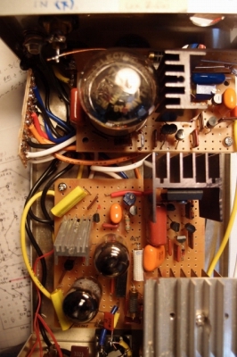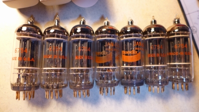 | 球はタフ | 慌てたり横着したりすると結果は決まっている そのことを地で行った 今回は整流管の±出力をショートさせた ただし間に50Ω5Wの抵抗があったのでいくらか緩衝材になったか ショートさせた時間は10数秒か 球が真っ赤になってしかも振動していたので気がついた なんとも可哀想なことをしたものだ 合掌 気を取り直してスイッチを入れ直した 6754(WE412A)は丈夫 BENDIX6754の方が作りもしっかりしていて丈夫に見える 相当なダメージだっただろうが生きていた 合掌取り消し 整流管は500時間の耐用とも言われているがこれにていくら費消したか やれやれ 2018.01.12 と思ったがそう甘くはなかった 真ん中のプリント色が濃いのが熱で焼けた+側に使っていた球だ 無負荷だと正常に電圧+114V程度が出るが負荷をかけると+80Vまで落ち込み使えない やはりこれは合掌だ |