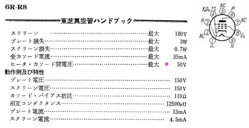 | CES規格 | 真空管の各規格値の許容範囲は現在のEIAJの前身の1950年代無線通信機械工業会制定の「CES規格」には真空管の各規格値の許容範囲は標準値に対して プレート電流は±25~30% スクリーン電流は±50% 総合コンダクタンス(gm)は±25~30% 増幅率(μ)は±15%となっていて かなり幅がある もちろん新品の場合のことだから中古では言わずもがな 私が耐圧などを75%程度に考えているのはこのようなことも起因している ぎりぎりというのは好まない所以でもある |