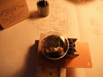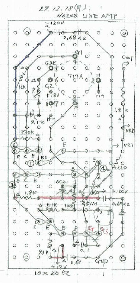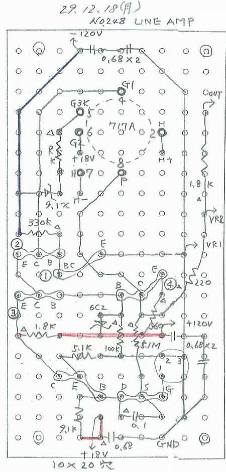 | Tr2コレクターの12KΩを乗せるのを忘却 単純なところで時間ロス これを乗せて所作は正常 Rk手前のD2は12V用でなく9.1XにしていたがこれではRkが800Ωになってしまうから12V(9.1x+3.3)にすると540Ωでオフセットは0Vに近づく ここは540Ωは無いので510Ωとした あとはSAOCでカバーする SAOCの半固定VR500Ωは25回転BOURNS社高精度多回転ボリュームとした SAOC-2SK170BL Idss10.1mA 今回使用の球は1942年製 私より年上だが75年の眠りを経てしっかりと稼働する真空管とはなんというデバイスなのか 当時の技術に感服そして音を聴いて再度感服感激することになるとは717Aのピン接続図 カソード+グリッド3(サプレッサー)はピン3に繋ぎたい気持ち 右の箱は1942年左は1943年製スタンプが薄くて写真では判読が難しいがそのようになっている