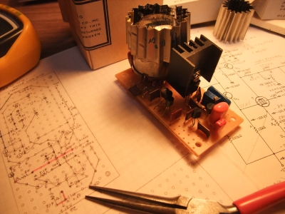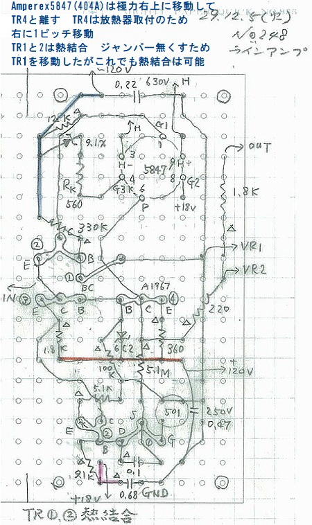 ![]() カレントラインアンプ基板に乗せた717AとA1967+放熱器 これだけで一杯の感 他のパーツは乗るのだろうか なんとも愛らしいマッシュルームのような真空管から如何なる音が飛び出すのか それにしても金田先生の製作記事の写真からもA1967は放熱器なし 相当熱いだろうな デバイスが可哀想に想う そのうちA1967より損失の大きく取れるTRに替えようと思っているがまずはA1967で聴いてみてからでないと可否が判らないから ![]() 717Aの配置スペースを確保するため下部のSAOC群を2ピッチ下へ詰めた 同時にC2240のコレクターとエミッターを交差した Rkのダイオード等の位置も下へ移動 これで717Aにも少しゆとりを持って配置される Rkは7本撚り線を基板に立てておいてそこ寝かせて配置する どうせ始めからドンピシャとはいかないから取り替えに手間の無いようにする TR4のエミッター抵抗を増やせば717Aのプレート電流を加減できる ここは560ΩにしてTR4には9.3mA程度流す A1967の損失も大分減るだろうから放熱器は要らないかも Rkにつながるダイオードはそのまま9.1xとする ![]() 正月休みにゆっくりと組もうと思案していたのがバタバタと・・・楽しみがなくなった 音の聴き比べとカレントラインアンプの取っ替え引っ替えをどうしようか 記憶はすぐに消えてしまうし ![]() |