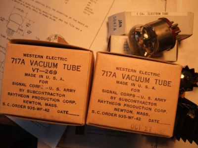 | WE717A | 717Aは少しストックが有る 金田アンプにぜひ使いたくて温存していたが時代は電流伝送 丁度良い回路が見つからなくて暫く経過した 今回はこのデバイスデビューの絶好の回路と見たが 果たして 717Aの形状に親しみを感じて今回のカレントラインアンプに採用したかったがヒーターカソード間耐圧が不明に付き留まった 前作のNo.244程度の電流なら許容範囲かと思う TR4の負荷抵抗を560ΩにしてTのD2を12Vにすれば良いだろう 音の違いを確認したいものだ その点ではC3gも興味がある WE717Aのヒーターカソード間耐圧が不明だが過去の記事から推測しよう No.189 ヒーターバイアスにRD24F カソードにかかる電圧-90.4V このことからヒーターカソード間には73V程度かかっているはずと思いきや No.205 ヒーターバイアス無し カソードにかかる電圧-104.5Vだから 〃 ヒーターカソード間には110V程度かかっているはずだ ヒーターバイアスをしたりしなかったり? 結局は不明 WE717AとWE384(Ehk=50V)は類似だがWE717Aは改良されているはず WE384も開発年によってはEhk=100Vという表記もあるらしい 安全なところでNo.248と同様に ヒーターバイアスにRD47F カソードにかかる電圧-80V前後にしてヒーターカソード間には40V程度という線で行こう 717A代替え球と言われている 6SJ7(Ehk=90V) 5693(Ehk=100V) なのだがこれをそのまま取り入れる訳にも行かないだろうし悩ましい 々 山本音響工芸株式会社のhpから 新入荷 Western Electric製717A真空管限定入荷 弊社のA08Sアンプに実装して選別済みNOS,NIBペア ¥14,000 保存状態により下部の袴部分に錆の生じている箇所がありますがご了承ください。限定入荷です。今後入荷する見込みはほとんどありません。 717A (Tungsol又はRaytheon) NOS白箱 マッチドペア \8,000 我が社がA-08,A-09等のパワーアンプに採用していますGTソケットの5極管。その愛らしい姿と音の良さが人気です。 特性は6AK5と同じでGmのみが4300um位と少し低めで使いやすいです。 6AK5はEhk=90Vだが特性は同じでも耐圧までは保証の限りではないだろう? たとえば“6J1”の互換球は以下の種類がある ・6AK5 ・6AK5W ・EF95 ・5654 ・5654W ・6BC5 ・403A ・WE403B ・CV4010 この中に6AK5も入っている 6J1Pを使うのも面白い