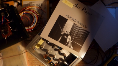 | 整流管の音 | 電源のダイオードを整流管に替えての試聴も正月に行った 整流管のレギュレーションのため整流管出力をレギュレータを通してNo.248プリに供給したが商用電源では+85Vと-90Vが限界だ トランスがAC80V-0-80Vのためだ 信濃のアイソレーション電源でAC100Vをキープするともう少し電圧が上がり±95Vはなんとかなるのだが プリの消費電流はプラスが45mAマイナスが27mA程度だがプラスが極端に落ち込む モノーラルだからステレオならこの倍となりレギュレーションは更に悪くなるのか レギュレーターも古いタイプだ 昔真空管プリ製作会の折に+95V用にMJ未発表のものだ このタイプのマイナスも作り温存していたものを今回使用していたのだ この際作り直すかと思うも最近のものはSiCを使うため入力電圧差は10V必要だから今回のレギュレーターには適さない 調べると真空管レギュレーターからSiC版に移行する間の貴重なタイプがNo.217版のようだ この回路は後のSiC版の元になっているからSiC版に替えるのも容易だ ![]() 今年の正月はダイオードを整流管に替えてみるなど電源から始まったが電源により音が左右されるから地味だが大事なところだ ![]() ±95VレギュレーターによりNo.248へ電源を供給する プラス側が0.47μF630V在庫なしにて黄色い適当なものを付けている このNo.217版レギュレーターは-100Vが半導体版として初お見見え 直ぐにTRからSiCに取って代わられこれ一代でお役目が終わった 整流管が多用されていた時代は2010.01月No.205まで No.199 真空管DACの記事中「真空管の音の特徴を活かすため整流管412Aを使用する」とある IVC DSCに整流管で整流されたものを直に繋いでいる 今回これと同じことを試みた EQにはレギュレーターからの±95Vを FAには整流管からの+97Vと-102Vを繋いでみた ハムはレギュレーターのときと同様一切出ない この時のEQ基板の消費電流は32mAに落ちた それでも整流管出力点で97V強の電圧は上がらないレギュレーターからはEQ基板のみに供給されるから少しは電圧が上がるだろうとの期待も無念 灯台下暗し ペッパーが聴きたくて探すと凄いのがあった 一度も聴いていないレコードだ 曲を見ると全て好きな曲ではないか 上の新プリで聴いてみた 凄い録音だ 良いなーと惚れ込んだ ところがステレオなのかも知れない DL102で聴く限りは盤を傷めないから両面を2回聴いた ステレオ装置に灯を入れるのも面倒なのでそのまま聴いた このレコードのどこにもステレオともモノとも表記されていない ネットで探すとCDではステレオというのがあった ![]() Among Friends/Art Pepper ペッパー、カムバック後のベスト・プレイをおさめた後期傑作アルバム。新たにリマスタリングされてペッパーのつややかでハリのある本物のアルト・サウンドが再現され最高の音質でLP化 !」とか 2018.01.06 ![]() 簡単なステレオ装置を用意してと思ったらプリは真空管しか対応できるものがない 半導体のものは電流伝送だし過渡期の今は困ることが多い FETパワーアンプを用意した ついでにEF86真空管プリの残り2台もチエックとなり大袈裟に スピーカーはFOSTEX10cm このようなサブシステムでも出てくる音は覇気のある金田アンプの音だ ゴチャゴチャで足の踏み場なし ![]() 結局このレコードはステレオだった 昨日モノーラル装置で聴いた時はモノだと思ったのだが この真空管プリ3台は製作してかれこれ15年は経つだろうか 最後に鳴らしたのは何時だか覚えていない 今回1台を除いて完璧 1台は半田が外れていた箇所が1箇所を繋いでOKだが半田って自然と外れるものか? それにしても通電しないで長期保存しても結構長持ちするものだと感心 アンプ3台あっても電源が1台 手放すにも電源が無いと安心して譲渡できないとて今更電源を作るのも気力がないし なんとなく今年は電源を整備する年のような気がしてきたが 2018.0108 そんなことをしているうちにH25の軽自動車のバッテリーが1/7に再起不能 今年の初物買いは電源?やれやれ +18VのREG 現在はSiC版がプリの基板に載っている 電源は高圧から供給のためSiCの損失が多い このためプラスの電圧降下が目立つから高圧REGの出力電圧を±95Vに設定している Rコアトランスの6.3Vヒーター巻線が余っているのでこれを倍電圧整流し+18Vを得て下図の2SK214を使った簡易REGから+15Vを真空管1箇所とSAOC2箇所と初段に供給した この結果100mV程度変動したオフセット電圧をEQとカレントラインアンプのSAOCのVRで最小にしてOKとなる 試聴してみたが音への影響はない 2SK214REG消費電流は計測していないが214は暖かくもならない程度だ(後刻測定=15.4mA)なにせ入出力電圧差は2VだからここはSiC入出力電圧差約10Vとは比べ物にならない 従ってここではSiCによるREGは使えない これにより高圧プラス側の電圧降下は解消され 整流管出力ポイントにて 変更前 + 97.7v 変更後 +104.2Vとなり マイナス側とほぼ同様の電圧となった(EQ基板消費電流は12mA程度) これなら高圧REGを±100Vに上げられる L型にしてケミコン ダイオード基板を下に 上にREG基板を配置 2SK214(215)はジャン
