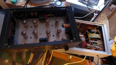 | カレントラインアンプを作った Amperex5847(404A)が手元に数本あった内2~3本は何かに使ったが使途不明 過去の金田アンプに404Aは顔出ししていないと思う 調べると105Vや100V真空管REGに使っていた そうなるとこの球のプリアンプとしての音は聴いていないはずだ 今回はWE404Aが2本しか在庫ないのでこれは温存し5847の出番とする 手元の5847はプリントも含めお世辞にも美しいとは言えない そのプリントはズレていてフィリップスとは思えない 10年以上も前だった@1200にて購入したものだ 実際,電源を入れた瞬間にフラッシュする特有の動作はAmeprexそのもの 管がピカッとフラッシュするのは精神衛生上よくないがこれは正真正銘Amperexであるという特徴だから(EQのT1[403]も当初からヒーターが一瞬光るがこれに少し遅れて5847はボワーッと控え目に灯る感じ) カソードのRKは調整結果540Ωでオフセット電圧が最小となったが手持ちの関係で560Ωとした パスコンは高耐圧のAPS等が無いので手持ちのものを適宜使用 ![]() SAOCの9.1KΩの方向性が反対 TR1とTR2は当初熱結合せずに使用 そんなにドリフトは無いように感じたがジャンパーを無くすため配置に無理をしている これでも熱結合は可能なのでTRの足を一杯にのばして結合 ヒーターカソード間電圧は40.7Vにて5847のEhk=55Vの75%程度に納まっている プレート電流 14.44mA TR4損失 1,463mW カソード電流 17.86mA T温度75℃(5847にラジエターを付けた これにて-5℃効果 80-5=75℃) カナダパール社の真空管ラジエターは-50℃効果があると言われるがその10分の1とは情けないが少しでも効果があれば精神衛生上良いのだろう なおパール社のテストでもラジエターの触れていない頭頂部は効果はゼロみたいだ ビフォー・アフターとも頭頂部の測定値だから暇を見て側面を計測したいと思う とにかく私は「熱いの恐怖症」なのだTR4温度63℃ 球の温度は思ったよりも高くなったがプリでここまで上がるのはそれなりの電流を喰わしているから TR4も放熱器を付けているが球からのあおりも手伝い熱くなる 大き目の放熱器を付けるためTR4と球は可能な限り離した 出力のスケルトン抵抗は220Ωがなく680Ωとした 以下回路図はMJ '16.08月No.248から引用 ![]() このプリの右側を今回球タイプにした上図にも記したがゲインコントロールVRはAカープの手持ちが10Kや20KΩしかないのでBカーブ1KΩを採用した レタリング目盛り10等分にしてある 丁度良いゲインは目盛り2~2.5位だから抵抗値も直読できるので便利だ これなら500Ω(B)でも良い Aカーブにこだわってきたがここに来てBカーブも使ってみて違和感なく良いと感じた 1kΩ(B)はパワーアンプのインピーダンスVRに使ってきた経緯があるので手持ちが数個あるからこれからも使っていこう さらにスケルトン抵抗で100Ω×5で500Ω(B)の抵抗群を作るのも良いかも知れない DACのゲインコントロールVRで体験したがアースに落とす部分の抵抗でも音に影響する No.221のカレントラインアンプでも同様でスケルトン抵抗によるアッテネーターは抜群の音となる |