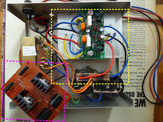 このドライブアンプの電源は当初ピンク枠のLM350(取り外してトランスの上に置いてあるもの)を使ったもので間に合わせていた (あまりにもドライブアンプに失礼だった)