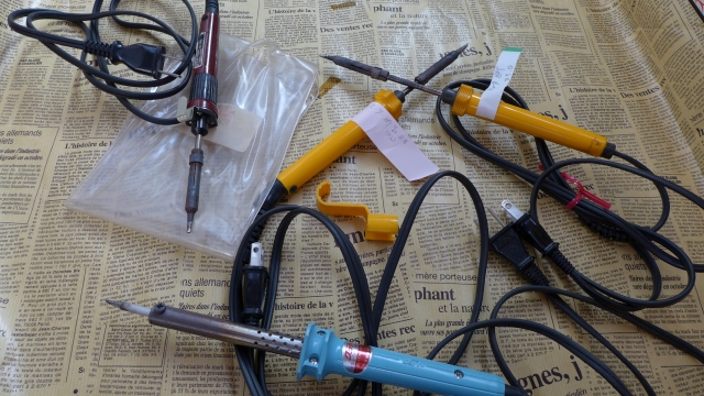 | 黄色いアンテックスは2本ともヒーター断 左の茶色は94年春新冠試聴会にてK先生からのいただきもの 黄色が駄目になって今日使ってみた 正常にてハンダの乗りも良い 下の水色は使い物にならない ハンダがこて先からコロコロと・・・ 黄色の1本めはH23.10にヒーター断 2本目はそれから9年使った |