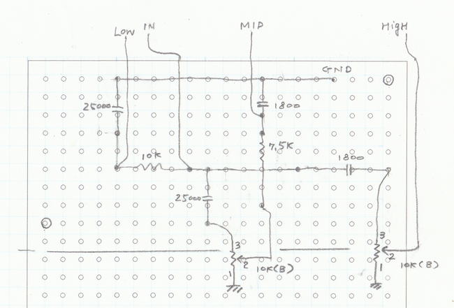 | 低域は25000pF(18000+7000)で 中域は25000~1800だ 高域は1800pFで試してみる |