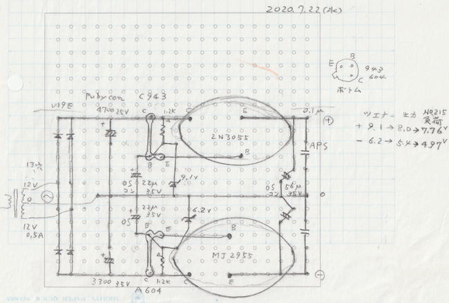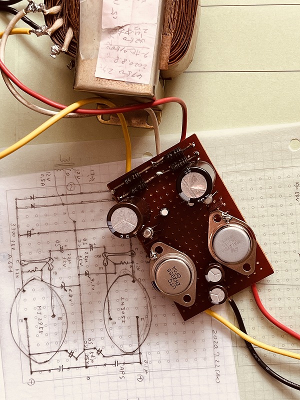 汎用トランスの電源 リップルフィルター 音は金田式レギュレーターと遜色なし 駄耳なので ![]() バラックで組んでみた 2N3055 MJ2955は放熱器無しで熱くもならない ほんのり程度 ![]() 回路図にツェナーが見えるが使わない 整流はジャンクの31DF2 inAC110V outAC10V 本窪田アンプL・R基板2枚の電流は200mA喰う OSコンデンサーの音の良さは経験済みだが今回は使用しない 2N3055 ・接合構造:NPN ・コレクターエミッター間電圧:60V ・コレクターベース間電圧:100V ・エミッターベース間電圧:7V ・コレクター電流:15A ・ベース電流:7A ・コレクターエミッター飽和電圧:3V ・ベースエミッターオン電圧:1.5V ・許容損失max.:115W MJ2955もマイナス素子だが同様 このフィルターはNo.215でも実績がある ![]() |