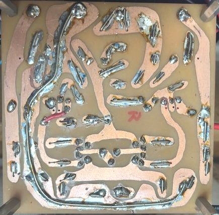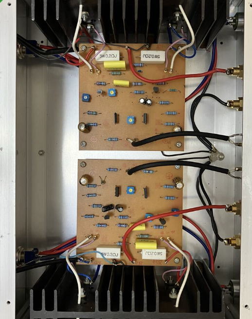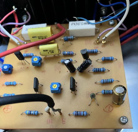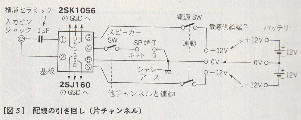 基板の表裏 ![]() ![]() 入手した基板はパーツの足を長いまま折り曲げて半田付けしてあるので取り替えに難儀する 通電して様子を見た 初段のVR1の500Ωを右回転して、C2655の100Ω両端に0.9Vを確認しセットする 2段のVR2の500Ωを右回転しても終段0.2Ω両端に0.02Vが出てこない (100mA程度のIoにしようと思うので0.02Vを考えたが何も出てこない) これはこれはK134とJ49が飛んでいるか何れかなのか 大事なパーツがNGとは・・・残念也 今はもう手に入らないが パーツボックスにK135とJ49・J50が2セットあったから取り敢えず片CHを取り替えてみよう 果たして出音するか 目論見通りか (K134は大丈夫でJ49がNGのような感じ あとからテストしよう 普通+側が飛ぶようだが・・・) MJ無線と実験に発表されていたものと同一ということが判明 プリントパターンも掲載されていた どこにどんな情報があるかによって時間ロスが防げる ネット情報は本当に助かる 「窪田式 All FET-DC-Amp」で検索すると以下の文面に行き着いた 「無線と実験」のバックナンバーを1996~2000年ころまで調べてみて 窪田式のアンプで 簡素でかつNO-NFBとできないか、記事を色々見ていると、96年8月号に「MOS-FET AB級7Wコンパクトパワーアンプ」と題して、ちょうどよい簡素なものが見つかった。これはドライブ段を省略した3段構成で、2段目がトランジスタになっていてNFBは10dBほどかかっているようだ。 |
