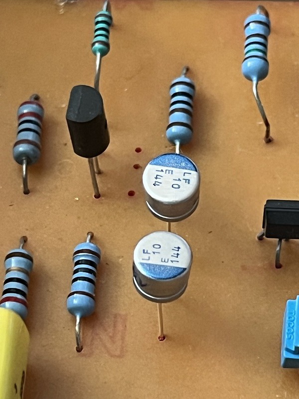 今回のオクでの出会いがなければ窪田アンプには一生巡り会わなったと思う 出会いは貴重![]() ![]() アースの引き回しは入手時の上の写真の通り以下の配線となっていた ただスピーカーへの出力まで一点アースからというのは自分には馴染まない やはり基板からスピーカーの+と-に配線したい ![]() オクにて金田アンプ?を落札 ケースと放熱器やスピーカーターミナルだけでも元は充分な感じ タカチのケースも入手が難しくなるし価格も結構する ケースのレイアウトが意に沿わなくとも加工済のところも助かる 段々と面倒くさ病が台頭 妥協病である 見た感じは窪田アンプだろうと思って落札したが案の定だ 窪田アンプは製作ももちろん調整も未経験ゼロ 少し違ったアンプに親しむのも悪くないだろう 最後は金田アンプに戻るだろうと思いつつ大きな道草である 基板から冒頭の回路を起こしてみた トラブルシューティング ①見た目の素子の劣化は電源ラインのインピーダンス抑制の47μF50V(ここは1~220μFなら何でも良いと)のケミコンのみの様子 写真の通りパンクし容量抜けしていてほぼ0μFだが経年劣化ではないだろう さりとて初段と2段の素子が健全だから高い電圧が掛かったわけでも無いだろう? ②NFB素子の低域増強用0.15μFのところ一桁多い1.5μFが付いていたので取り替えた ターンオーバー側周波数用の1KΩと5μFのところが22+22μFで11μFとなっていたので取り替えよう 時定数を大きくすると低域端が持ち上がる特性となる ![]() 1kHzのゲインは10.6倍 増やしたい場合NFBの1KΩを750Ω(15倍) 470Ω(23倍)にする 低域増強用 今回の標準は0.15μF 76Hz +3dB ここが0.068μFでは200Hzで 右にシフト ここが0.27μFでは50Hzで 左にシフト するとのこと 入手時は1.5μFが付いていた訳だが・・・? 単なる数値の読み違いだろう ③33pFは発振防止ではなく数MHz附近に若干のピークがあったのでこれを補正して100kHz以上がなだらかに減衰するようにしたとのこと ![]() ターンオーバー側周波数用の1KΩと5μFのところの素子をランクアップした フィルムコンでも良いのだが4.7μFとなると大きすぎて見た目のバランスもあるが何しろ手持ちがない 窪田アンプ製作1996-8記事から 4.7μFとなると大きすぎて? ![]() 半導体アンプ製作技法 単行本 – 1995/2/1 窪田 登司 (著)が送料込みで940円だったので購入する |