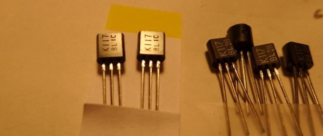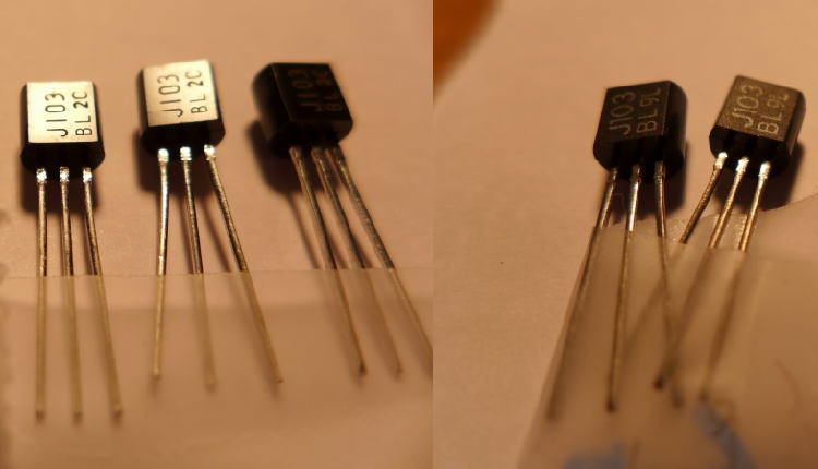 2SK117 今回購入は左(テカリがある) 右(テカリなし文字も異なる)は昔の在庫![]() 2SJ103 今回購入は左(テカリがある) 右(テカリなし文字も異なる)は昔の在庫 ![]() 昔の在庫は表面がザラついている 印刷は似たようなものだが表面仕上の関係で字が細くあるいは太く見えるようだ 今回のものは彫りが入っているようにも見えるがプリントで載せているだけだ |