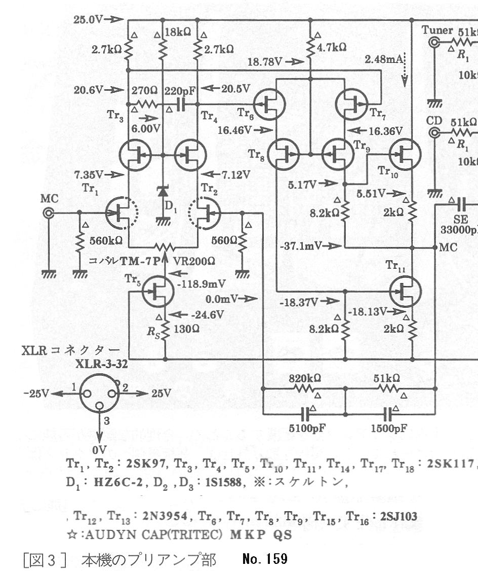| 今検討しているEQアンプ No.159のEQ部 TR1.2をFD1840に替えて 入力インピーダンスを47KΩ程度して ちょうど良くなると思う あとはTR2ゲート抵抗を少し変える MJ2000.06から引用 |