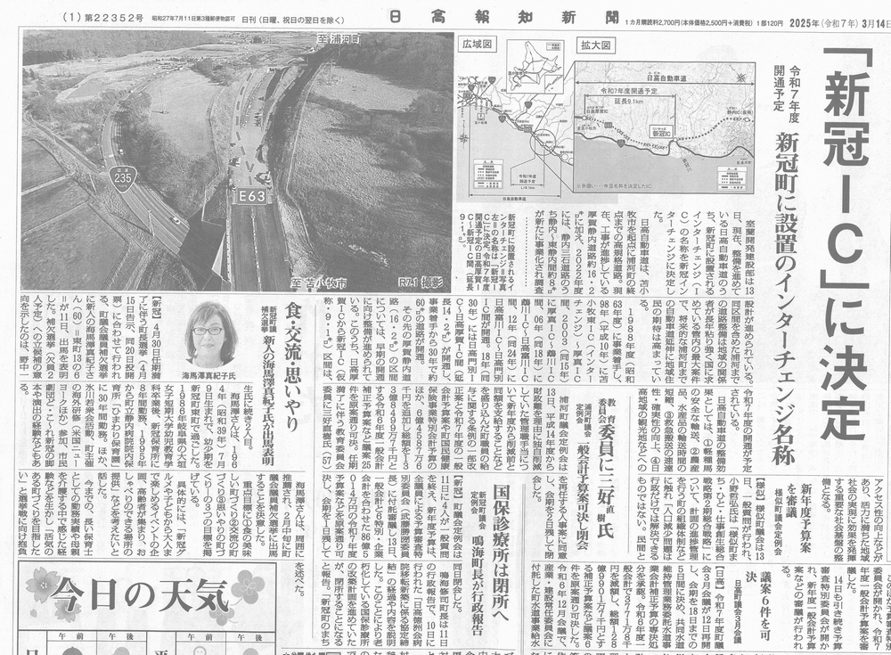 30.03.05 新年度予算 鳴海町政始動 北海道建設新聞 日高報知新聞 執行方針300309付け日高報知新聞追加