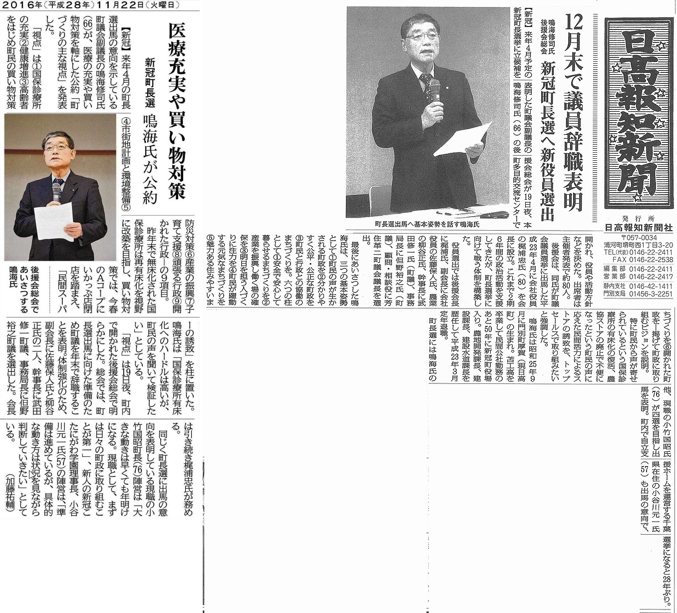 28.11.19 新冠町長選挙 29.4月 鳴海 修司氏後援会総会で施策発表 左 道新 右 日高報知からそれぞれ引用