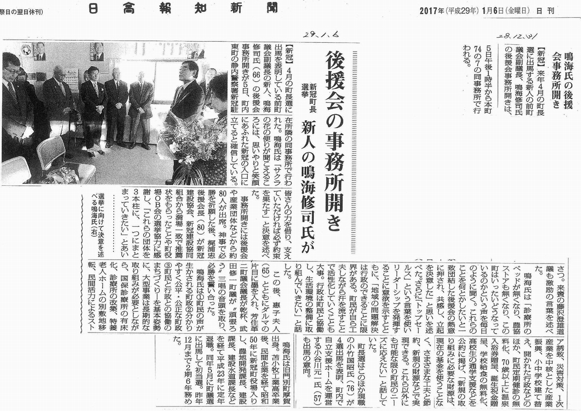 29.1.5 新冠町長選挙 29.4月 鳴海 修司氏後援会事務所開きで詳細施策発表 道新 日高報知からそれぞれ引用 いよいよ更なる具体的な施策が見えてきました。新人に期待されるところが大デス。 日高報知に紹介されていますが 「 桜の花の便りが聞かれる頃には、「思いやりと笑顔にあふれた新冠」の入り口に立てると確信しています。 皆さんのお力を借り、支えていただければ、鳴海修司は必ずや約束は果たしますことをお約束して挨拶とさせていただきます。」 というくだりは、心打たれますね。