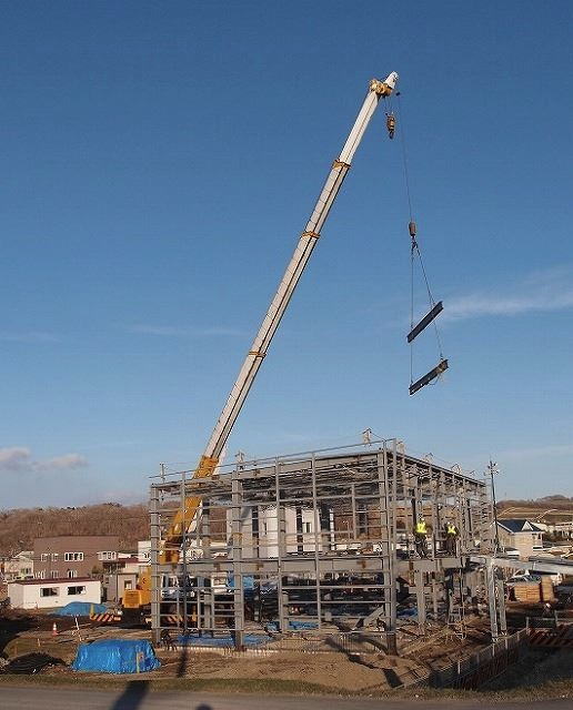 ちびっこ広場も様変わりします。ニョキッと鉄骨の組み上げクレーンがこの辺りでは見たことのない高さに骨材を持ち上げて、寒さの中で頑張っています。