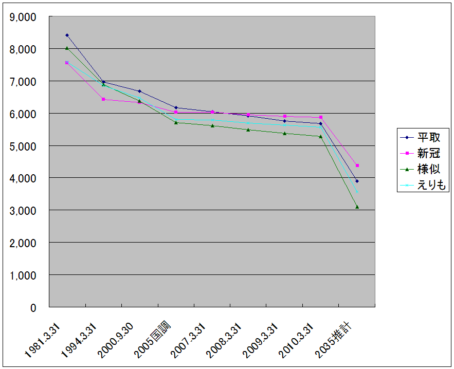 | 様似 | 8,009 | 6,883 | 6,382 | 5,711 | 5,616 | 5,486 | 5,410 | 5,380 | 5,323 | 5,273 | 3,103 |