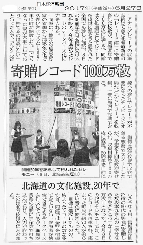 新冠町は人口七干人弱の過疎の町だ。だが、このような小さな町にも世界に誇れる文化事業が誕生することは、若者のUターンが期待できる何かが生まれるのではなかろうか。町を離れて生活している入々の心の糧になるのではなかろうか。そして、わが町に思い出のつまったレコードを託してくれた人々には、もうひとつの故郷になるのではなかろうか。 (1991.11.4掲載-日本経済新聞-)