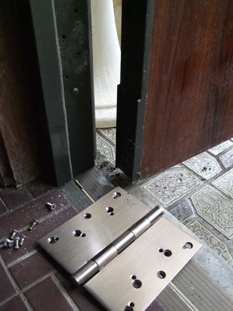 このアドレスから詳細がわかる。 1回の注文が3,000円(税別)以上で配送料無料!」というのが助かる。 ![]() ![]() しかし、相当劣化していたのだ。下手をしたらドアが倒れたかも?クワバラ々。 ![]() 上はまだ使える。 ![]() これは取り替えた後の写真。形状が少し違うだろう。 ![]() このように既存の穴は5つのうち4つは使えないので、新たに穴をあけてスクイを入れて使用。 ![]() なんか、傷だらけ。。。 (2011.07.17) |